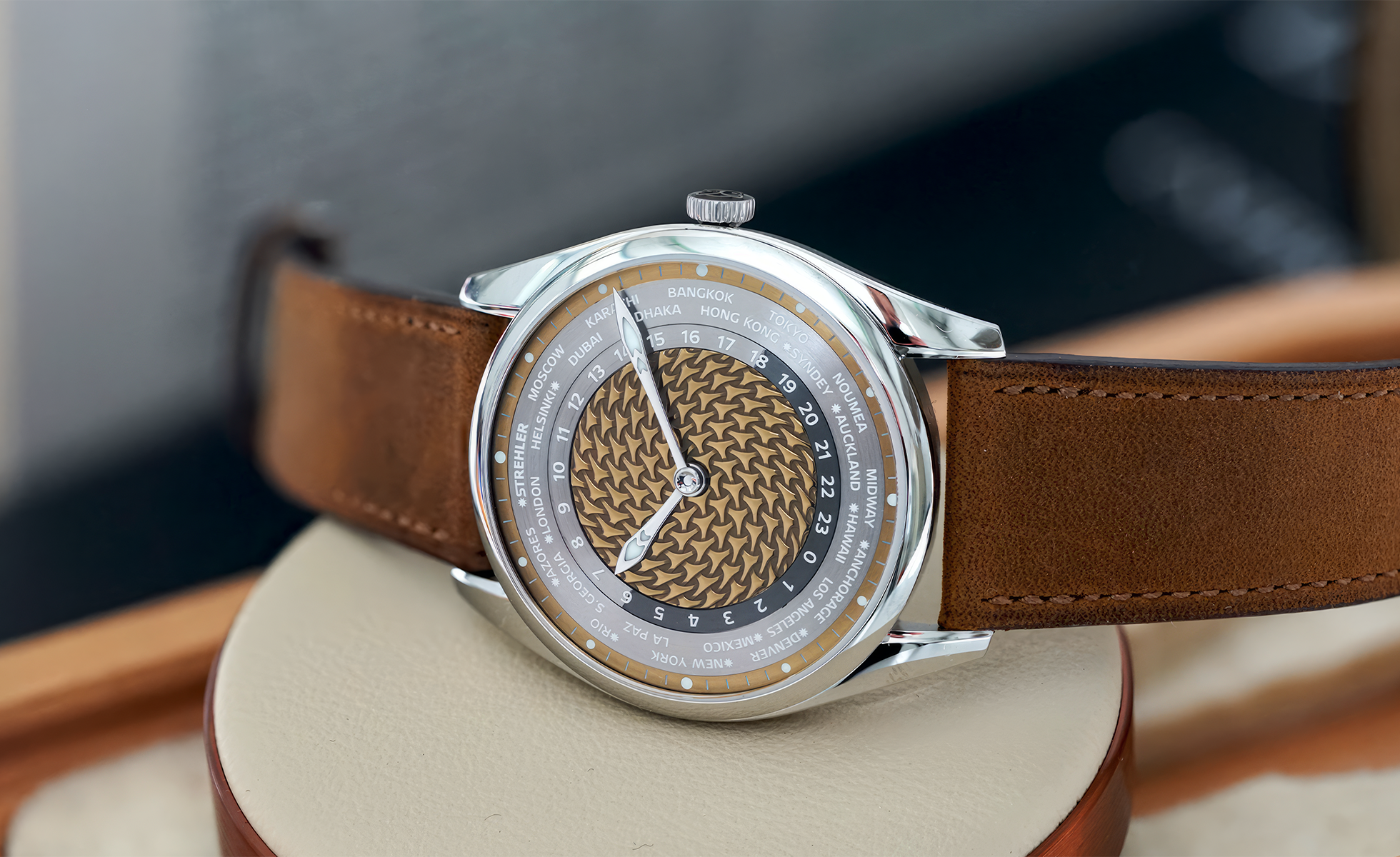 The titanium dial features a sculptural three‑dimensional texture, individually machined, engraved, and hand‑polished. Its pattern is adapted from a design created with Eric Giroud for Sirna. Surrounding it, the 24‑hour ring marks day and night and rotates once per day, aligning with a fixed city ring listing 24 time zones. Central European Time is indicated by “Strehler” rather than a city, and DST‑observing cities are marked with a sun symbol. Both the city disc and 24‑hour disc use luminous printing, with additional luminous dots along the minute track.
