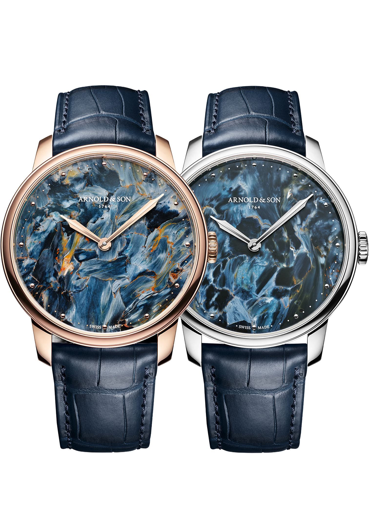亞諾(Arnold & Son)推出 HM 系列的兩款全新力作,表盤採用產自纳米比亚的皮特石打造 。這種被譽為“風暴之石”的裝飾性礦物屬於玉髓家族,由西德·彼得斯於 20 世紀 60 年代初發現 。每一枚獨一無二的表盤都呈現出細膩的旋渦紋理,宛如康沃爾郡波濤洶湧的海面與變幻莫測的天空,而那裡正是品牌創始人約翰·雅諾的故鄉 。此設計不僅向這位英國制表大師的非凡巧思致敬,也禮讚了在當代世界中依然堅定前行的人們 。