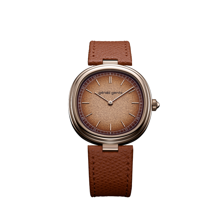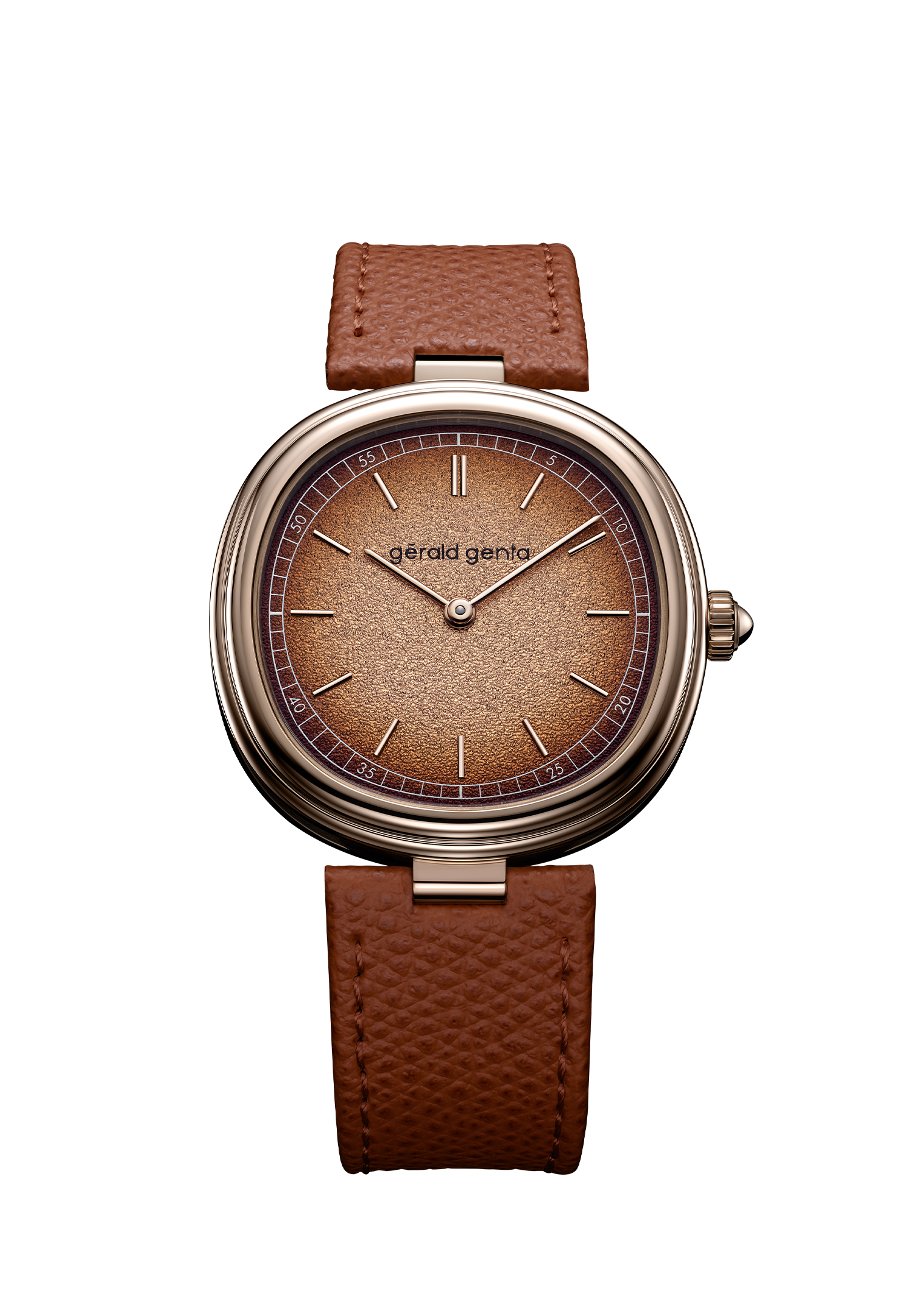 Geneva Time Only Marrone 完美呈現 Gérald Genta 設計語言中溫潤而具雕塑感的美學。38mm 4N 玫瑰金枕形錶殼在柔和與俐落之間達到平衡,搭配具煙燻漸層效果的棕色磨砂黃銅錶盤。拋光玫瑰金指針與時標帶來細膩光影,呈現低調卻精緻的質感。
