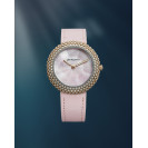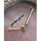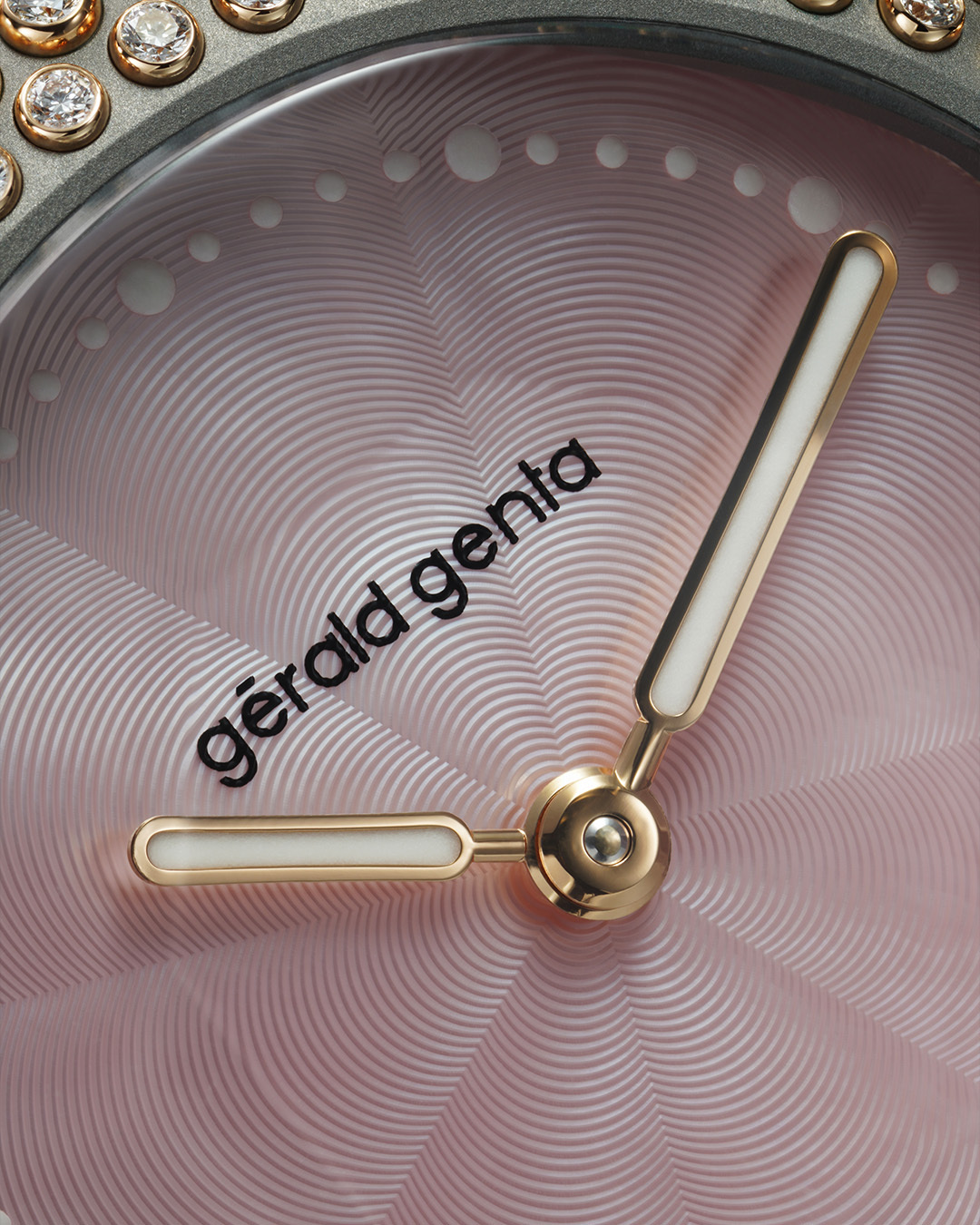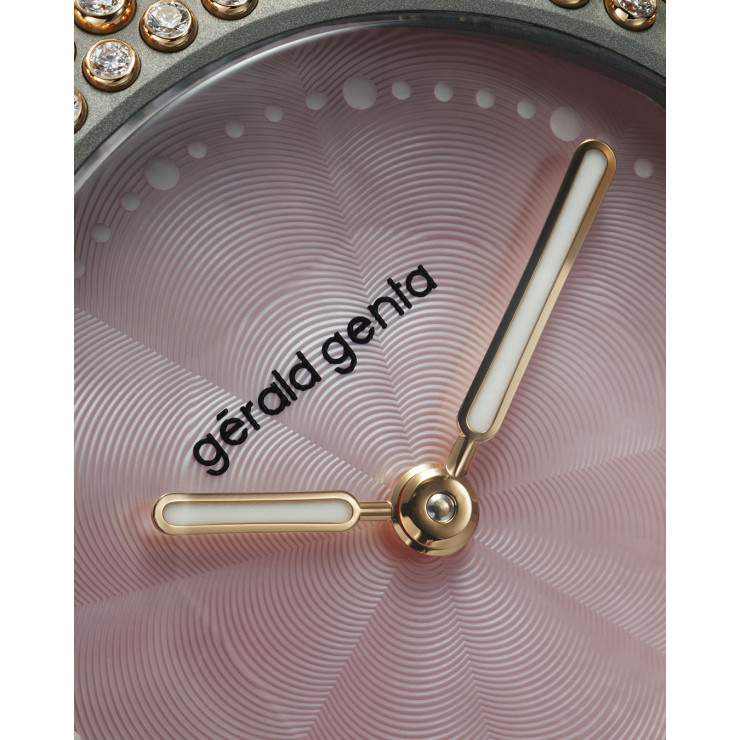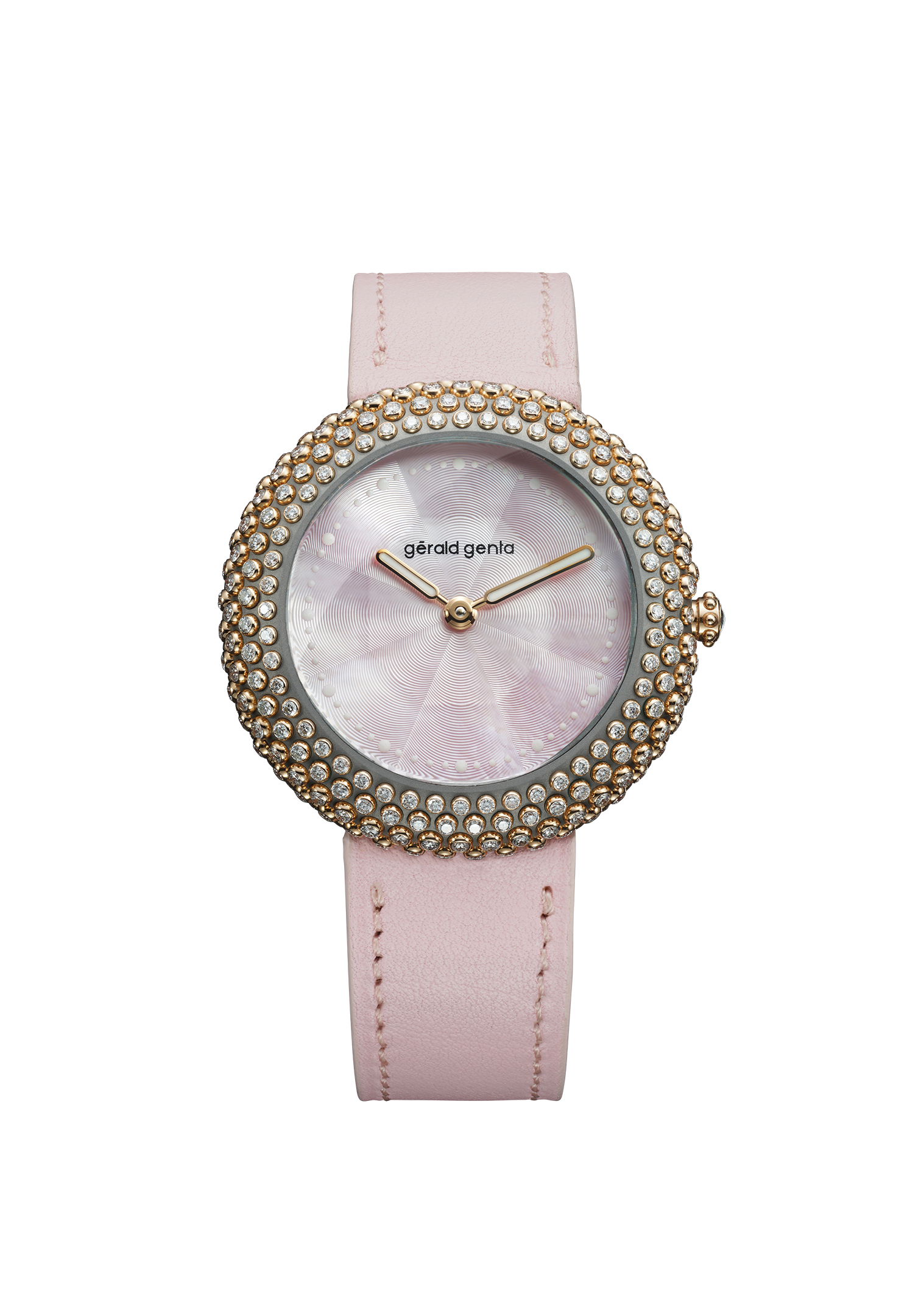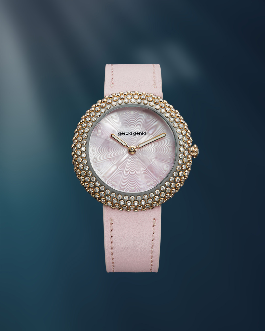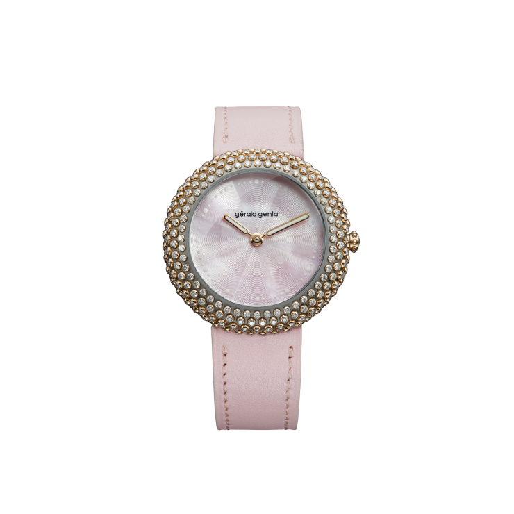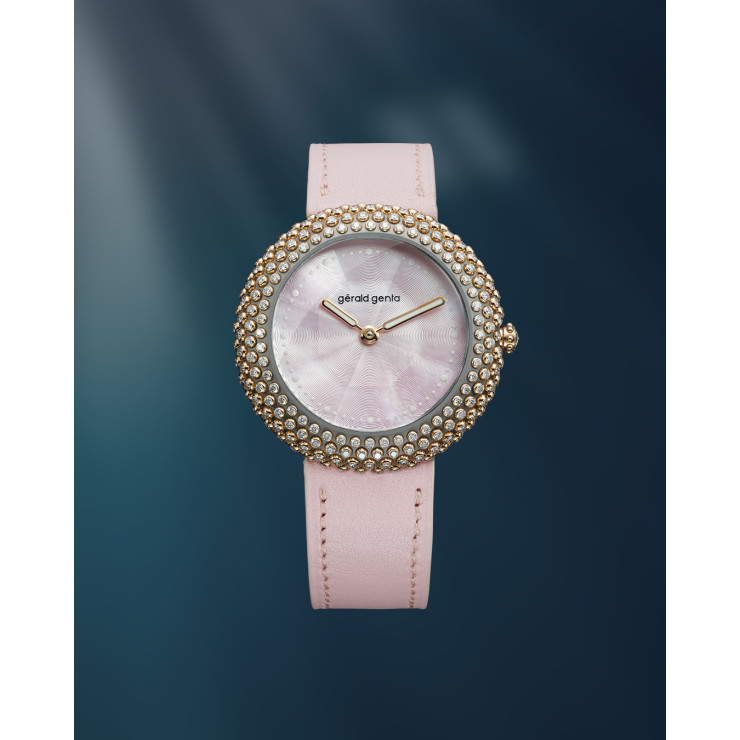 Oursin 36 粉紅珠母貝以 鈦金屬凸面錶殼鑲嵌 223 顆玫瑰金與鑽石珠飾,搭配通透的粉紅珍珠母錶盤(扭索紋)。八面切割藍寶石水晶在中央映出低調八角光影;**GG‑005 自動機芯(Zenith Elite 基礎)**提供 4Hz/50 小時表現;粉紅小牛皮錶帶與 30 米防水兼顧華麗與實戴。