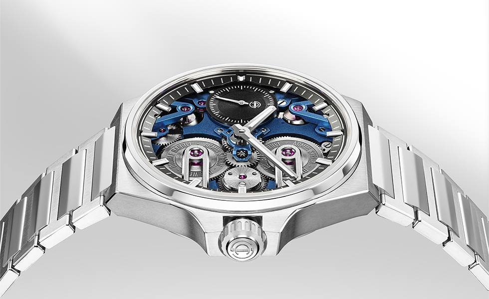 Encased in a 41 mm stainless steel case and paired with an integrated steel bracelet, the watch features a fully openworked architecture. The traditional dial is replaced by a blue PVD-coated mainplate, creating a vivid stage for the movement’s choreography. Every component is arranged in perfect symmetry, emphasizing depth, contrast, and clarity.