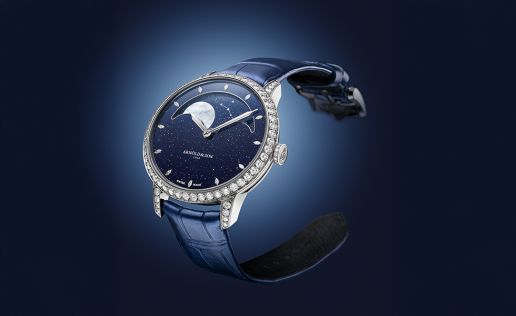 The case, measuring 41.5 mm in diameter, is sculpted with refined lugs and a slim bezel that opens up the dial to its full celestial display. On the reverse, a secondary moon-phase indicator allows for precise adjustment of the moon’s age.