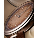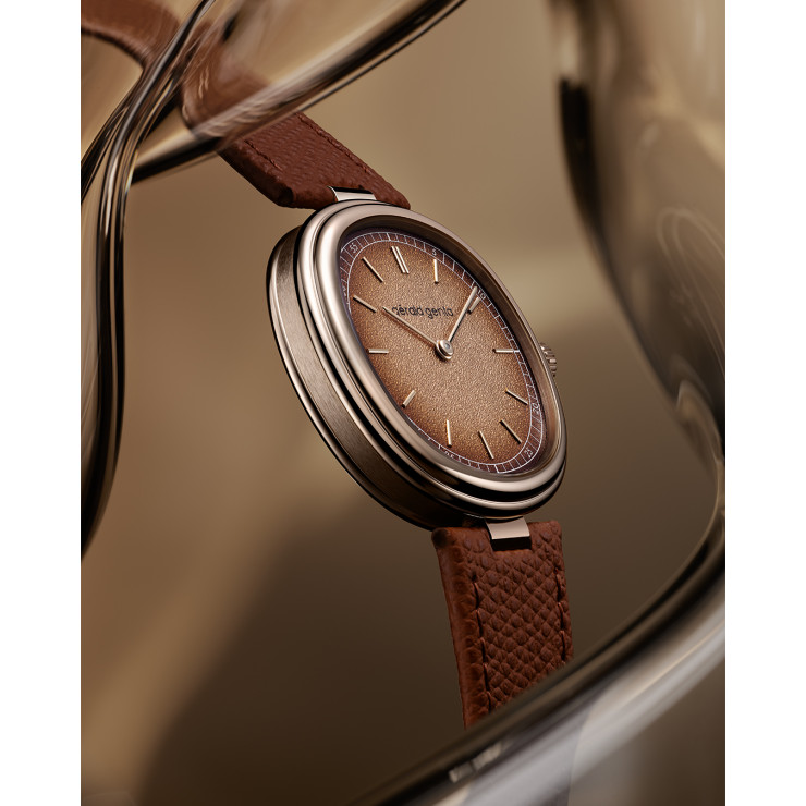Geneva Time Only Marrone 完美呈現 Gérald Genta 設計語言中溫潤而具雕塑感的美學。38mm 4N 玫瑰金枕形錶殼在柔和與俐落之間達到平衡,搭配具煙燻漸層效果的棕色磨砂黃銅錶盤。拋光玫瑰金指針與時標帶來細膩光影,呈現低調卻精緻的質感。