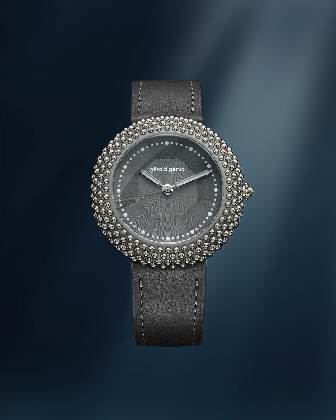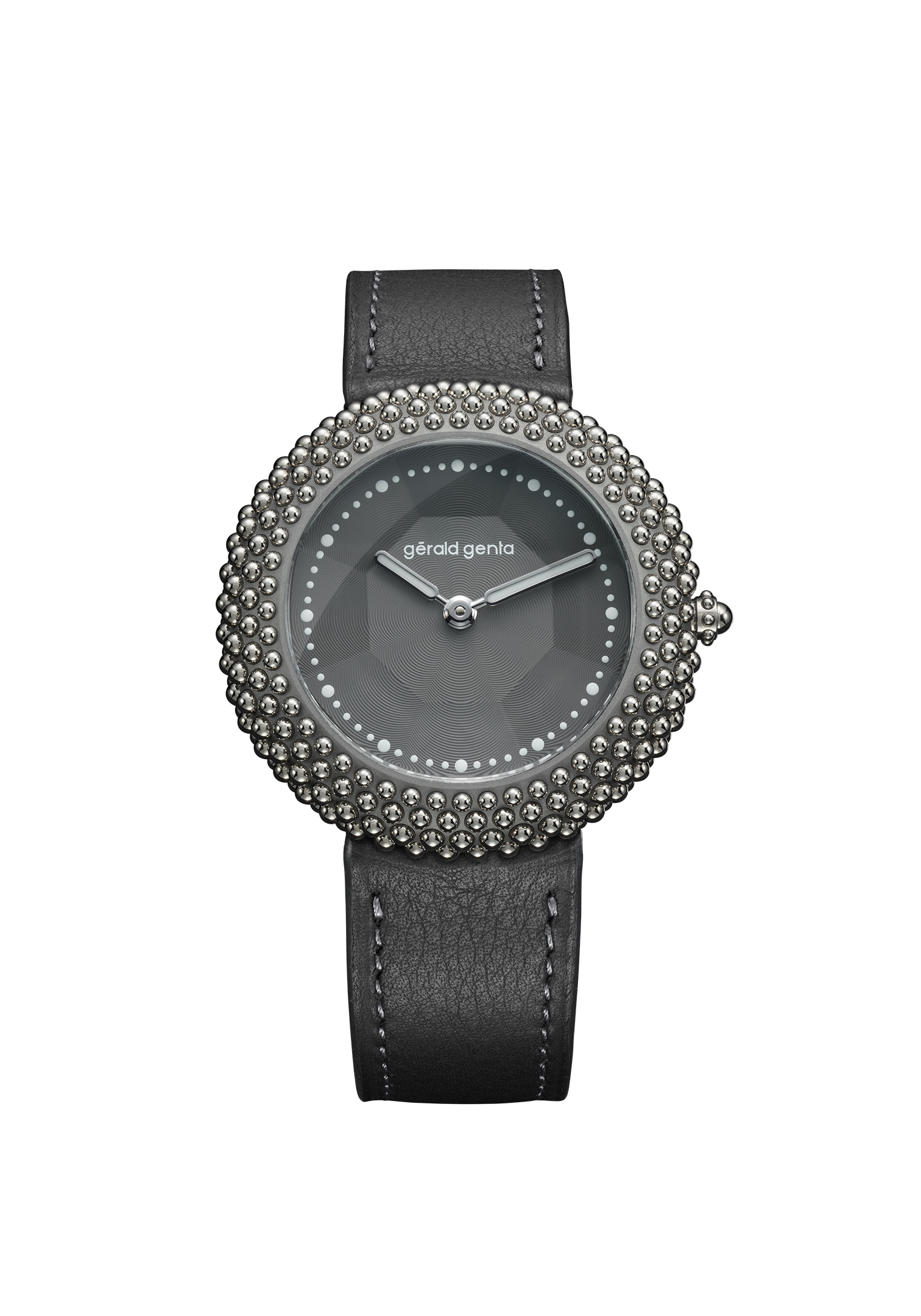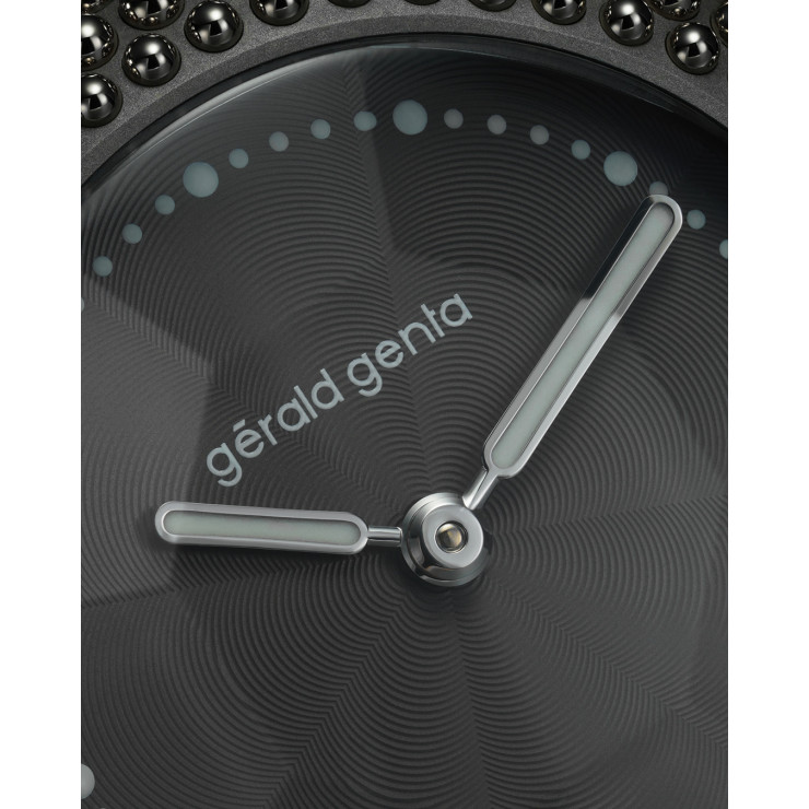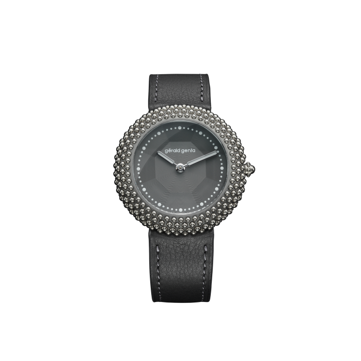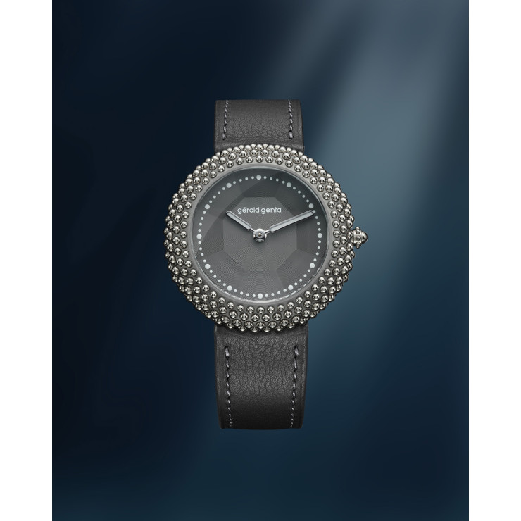 Gentissima Oursin 36 Anthracite 灰以 36.5mm 鈦金屬凸面錶殼鑲嵌 223 顆拋光白金珠飾,呈現亮澤而富層次的立體線條;煙灰色扭索紋錶盤置於 八面切割藍寶石水晶之下,映出品牌經典八角元素。腕錶搭載 GG‑005 自動機芯(Zenith Elite 基礎),4Hz / 50 小時動力儲存,配 灰色小牛皮錶帶與 30 米防水,適合日常優雅佩戴。