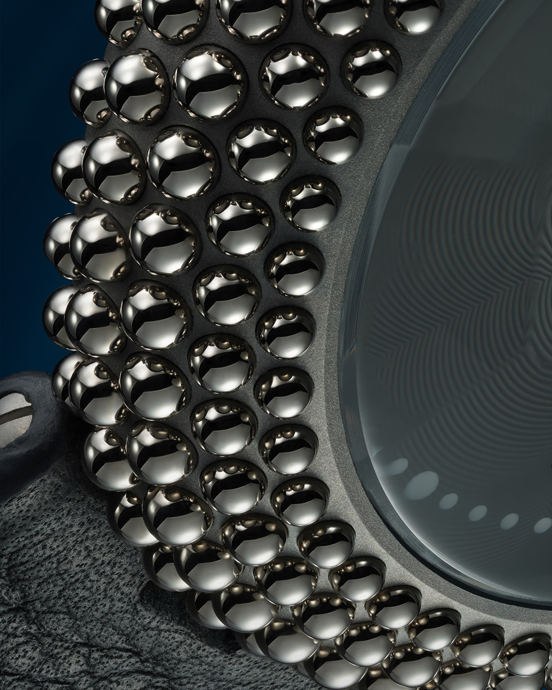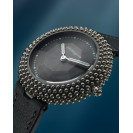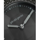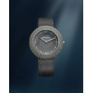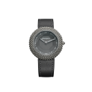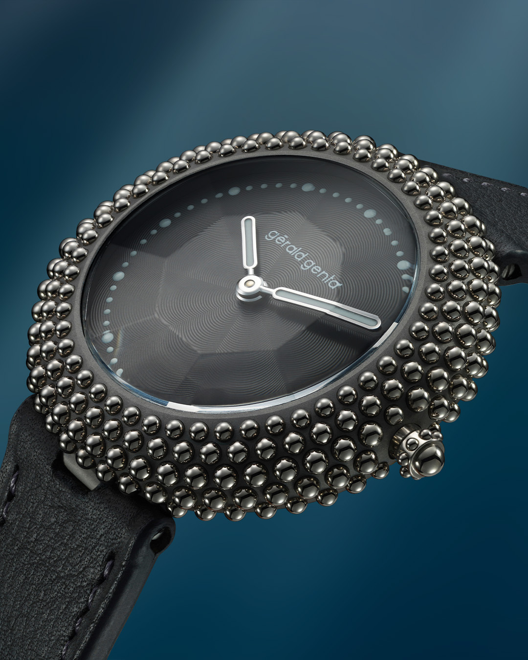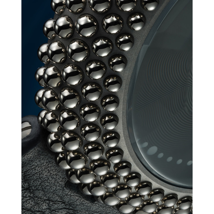 Gentissima Oursin 36 Anthracite 灰以 36.5mm 鈦金屬凸面錶殼鑲嵌 223 顆拋光白金珠飾,呈現亮澤而富層次的立體線條;煙灰色扭索紋錶盤置於 八面切割藍寶石水晶之下,映出品牌經典八角元素。腕錶搭載 GG‑005 自動機芯(Zenith Elite 基礎),4Hz / 50 小時動力儲存,配 灰色小牛皮錶帶與 30 米防水,適合日常優雅佩戴。
