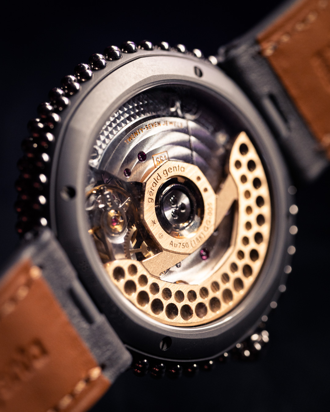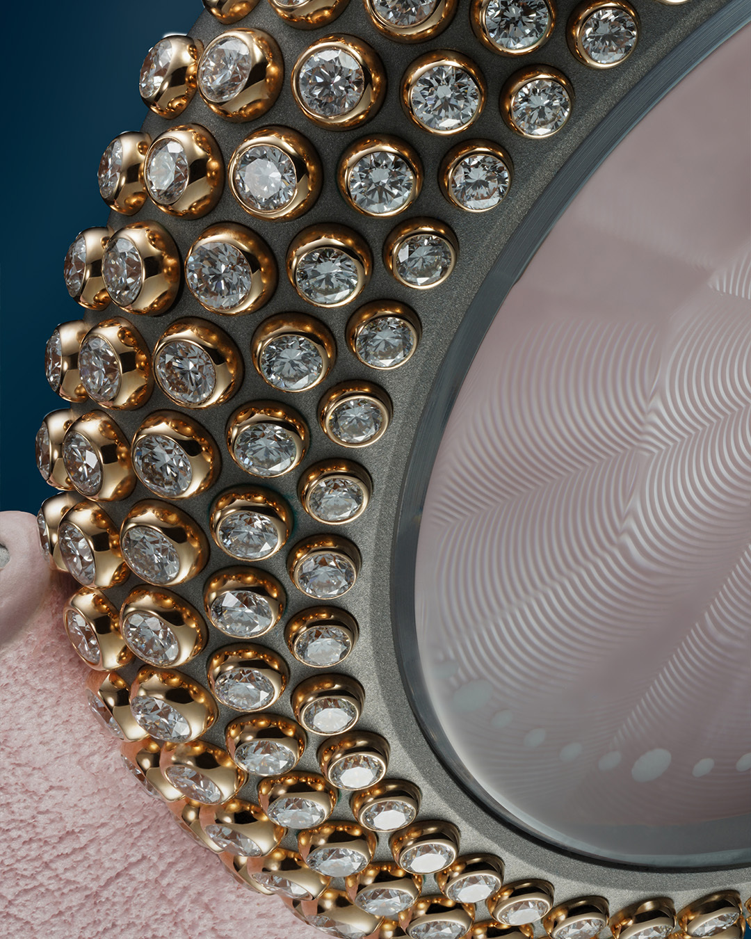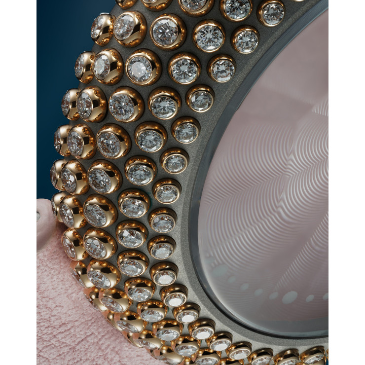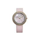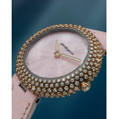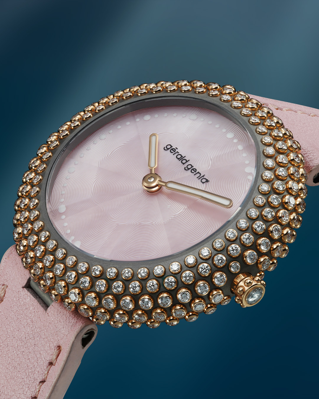 Oursin 36 粉紅珠母貝以 鈦金屬凸面錶殼鑲嵌 223 顆玫瑰金與鑽石珠飾,搭配通透的粉紅珍珠母錶盤(扭索紋)。八面切割藍寶石水晶在中央映出低調八角光影;**GG‑005 自動機芯(Zenith Elite 基礎)**提供 4Hz/50 小時表現;粉紅小牛皮錶帶與 30 米防水兼顧華麗與實戴。